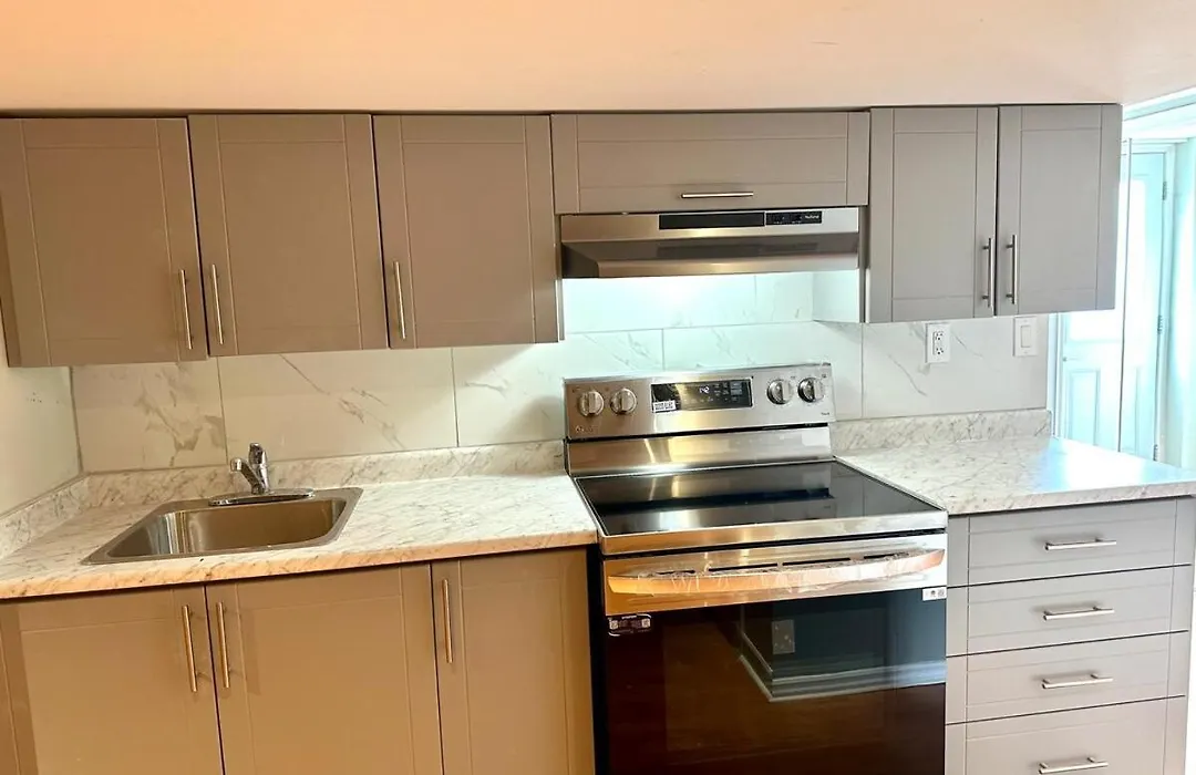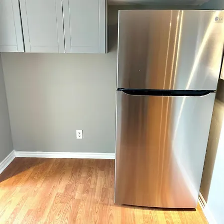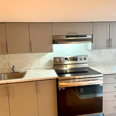 Beautiful Walkout Basement Apartment offers a fully-equipped kitchen with all necessary appliances.